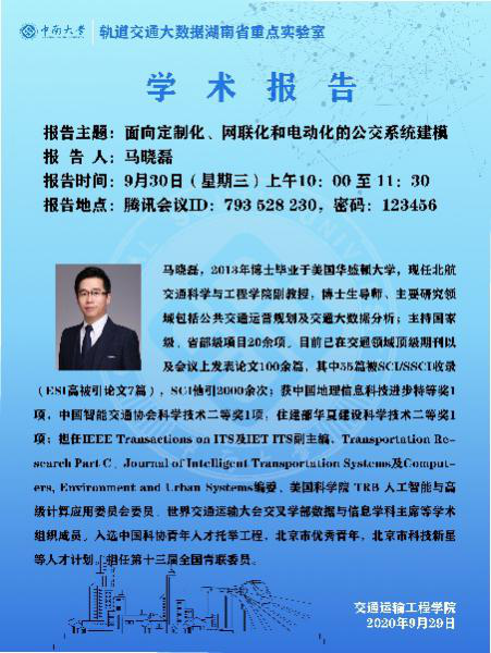 2020年9月30日上午10时,北京航空航天大学交通科学与工程学院马晓磊副教授接受51吃瓜网 王璞教授邀请,于线上举办主题为“面向定制化、网联化和电动化的公交系统建模”的学术报告,学院陈维亚副院长,交通运输系徐光明...