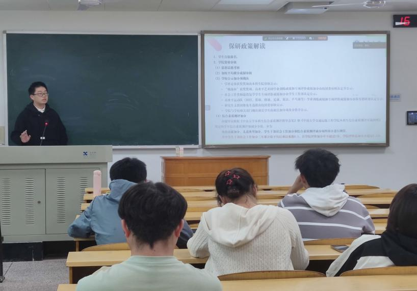 接下来就是成功参加支教保研计划的卜憧亦同学为同学们带来有关支教保研的经验分享。卜憧亦同学首先对“支教保研计划”进行一个详细的介绍,包括计划报名要求、成功通过的必备条件及对应的发展方向等。同时他还向同学们分享了相关的竞赛经验以及选择合适竞赛的思路等。