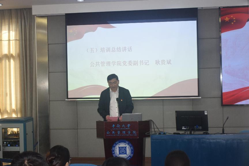 典礼第五项,公管院党委副书记耿贵斌发表培训总结讲话。耿贵斌书记首先对为本期培训班付出努力的老师们表示了感谢,并对学员们的顺利结业提出表扬和祝贺。随后就“端正入党动机,坚持全面发展”“坚定理想信念,筑牢思想根基”“理论联系实际,提升实践能力”三个方面对全体学员们提出殷切希望,告诫学员们需要就进一步入党发展的相关问题持有理性正确的态度,时刻都要以党员的标准严格要求自己,不辜负组织的培养和重托,以实际行动早入加入中国共产党。