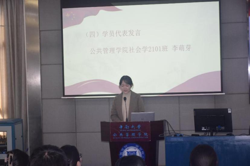 典礼第四项,公管院李萌芽同志代表本次培训班全体学员发言。李萌芽首先感谢了本次培训班所提供的学习和交流的机会,接着从学思践行的角度深刻地讲述了本次培训班的学习感悟,并进一步表达了学史明理、学史增信、学史崇德、学史力行的党史学习目标。“乘风好去,长空万里,直下看山河”,李萌芽呼吁全体学员在党史的传承中汲取养分和动力,在红色文化的浸润和熏陶下树立正确的历史观,真正意义上做到党性修养内化于心,外化于行,并在开拓进取的道路上贡献不竭的青春力量,在实现中华民族伟大复兴中国梦的征程上谱写青春篇章。