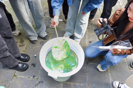 在学习完漆扇制作的基础知识后,党员同志们满怀期待地前往非遗漆扇制作现场,首先挑选了各自心仪的扇子形状,然后将大漆滴入清水中,轻微搅拌后将白色扇面放入水中,或旋转,或轻摇,不同的摆动方式和幅度所获得的图案独一无二,各有千秋;绚丽多彩,高贵典雅。