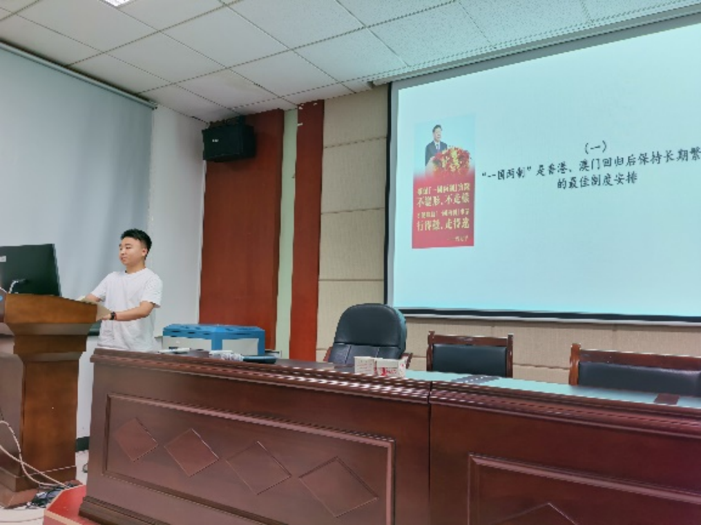 五位支委依次上台,向全体党员讲述主题党课。首先李茜同志以“坚持在发展中保障和改善民生”为主题分享道:增进民生福祉是发展的根本目的,分配制度是促进共同富裕的基础性制度,就业是最基本的民生,社会保障体系是人民生活的安全网和社会运行的稳定器,人民健康是民族昌盛和国家强盛的重要标志。孙光宇同志围绕“坚持人与自然和谐共生”从生态文明建设的必要性、重要性与具体措施出发,循序渐进,逻辑严谨,图文并茂地讲述了生态文明建设的相关理论知识。随后,颜亚超同志进行了“坚决维护国家安全和社会稳定”的主题党课分享,他表示,统筹发展和安全是我们党治国理政的一个重大原则,我们要坚定不移贯彻总体国家安全观。余晨同志从听党指挥、能打胜仗、作风优良,党对人民军队的绝对领导,全面提高新时代备战打仗能力,全面推进国防和军队现代化,构建一体化的国家战略体系和能力五个方面,与大家分享了习近平新时代中国特色社会主义思想关于“把人民军队建设成为世界一流军队”的内容。最后苌艳路同志以“坚持和完善‘一国两制’,推进祖国统一”为主题分享了“一国两制”是香港、澳门回归后保持长期繁荣稳定的最佳制度安排,坚持依法治港治澳,推动“一国两制”实践行稳致远和牢牢把握两岸关系主导权和主动权,坚定不移推进祖国统一大业三个方面的内容。