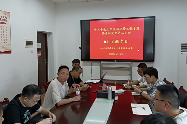 6月29日下午14:30,博士研究生第二党支部联合博士研究生第一党支部于高速列车研究中心北楼201举行了“扬青春力量,担时代重任”毕业季主题党日活动,加强毕业生党员教育,为即将奔赴祖国各地建功立业的毕业生党员增强信心与送去祝福。本次活动由博士研究生第一党支部书记王中钢主持,博士研究生第二党支部书记王家斌出席,并特邀高速列车研究中心教职工党支部副书记刘堂红主讲毕业生党员教育主题党课——《讲奉献,有担当》。