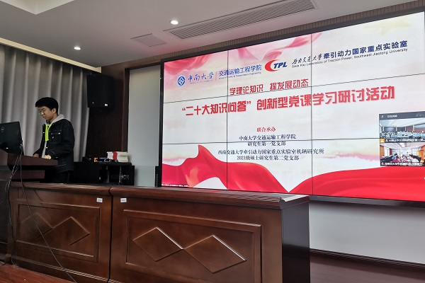 研究生第一党支部于交通楼425开展与西南交通大学牵引动力国家重点实验室机车车辆研究所2021级硕士研究生第二党支部联合举办的“青春献礼二十大,强国有我新征程”支部共建系列活动第二期——“学理论知识,探发展动态”创新型党课学习研讨,活动由双方支部书记刘家忱同志和黄勉同志主持,双方支部全体党员和入党积极分子参加本次活动。