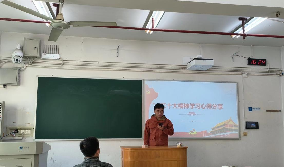 大会第二项,支部成员畅谈学习党的二十大精神的感想与收获。付艺聪同志提到,作为青年学生,应当坚定不移跟党走,怀抱梦想又脚踏实地。江禄民同志谈到,党的二十大报告是社会主义现代化新征程下的行动指南,也对未来党和国家的奋斗目标提出了更为明确的方向,青年学生应当紧跟时代脚步,积极参与到新时代中国特色社会主义事业建设之中。