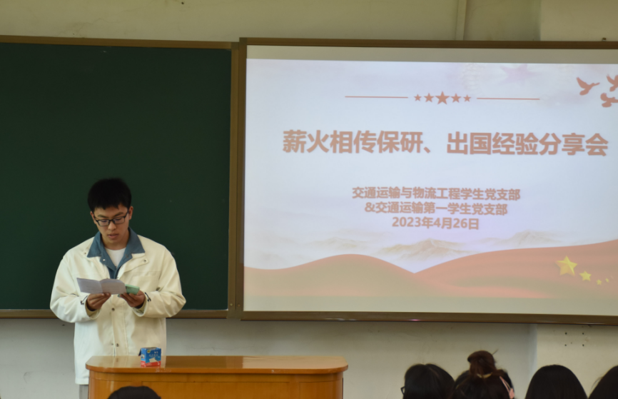 4月26日下午14:30,交通运输第一学生党支部与交通运输与物流工程学生党支部联合党支部以线上线下相结合的形式,于世纪楼B502教室举行了“薪火相传”保研、留学经验分享交流会。本次活动邀请了联合党支部八名2019级同志进行经验分享,由交通运输第一学生党支部的卫诗豪同志主持。