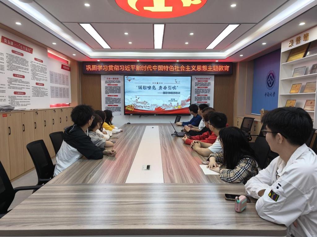 国歌领唱团作为思想引领特色实践团队的责任担当。结合新时代特征,他着重剖析了传唱国歌的当代价值,引领青年在新时代唱响精神力量。在技巧培训环节,会议聚焦国歌演唱中的情感传递,引导同学们深入体悟歌词承载的历史厚重感,将"起来"的呐喊与"前进"的呼唤转化为澎湃的声浪,用音乐语言诠释爱国情怀。尾声阶段,全体成员肃立齐唱国歌,铿锵旋律响彻会场,展现出新时代青年对祖国的赤子之心。