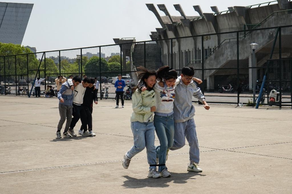 随着一声哨响,趣味接力跑比赛拉开帷幕,每组4名参赛队员们全情投入,默契配合,以丰富有趣的方式完成4棒传递接力。随后,三人绑足项目也在一声声“一二一二”的口号中展开,每组参赛队伍均是三人四足,一同从起点出发,迈着整齐的步伐并肩冲向终点。场上同学们耳后生风,你追我赶;场边的观众欢呼雀跃,加油助威。