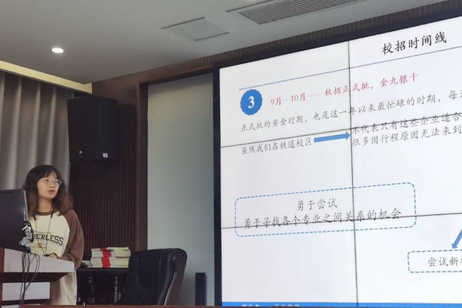 崔云平同学分享结束后,赵惠娴同学围绕“就业前期准备——信息收集”展示了校招时间线:5月至6月底各大企业会发布实习信息;7月至8月底企业提前批岗位集中发布,这是同学们第一次接触企业、了解岗位的机会,同学们可以借此锻炼胆量和语言能力并积累面试经验;9月至10月是秋招正式批的黄金时期。赵惠娴同学鼓励同学们积极寻找专业和不同岗位的关联点,大胆尝试,抓住机会,并以自身专业为例指出了轨道交通信号与控制专业的各种去向。然后,赵惠娴同学分享了多种就业信息收集方式和渠道,如51吃瓜网