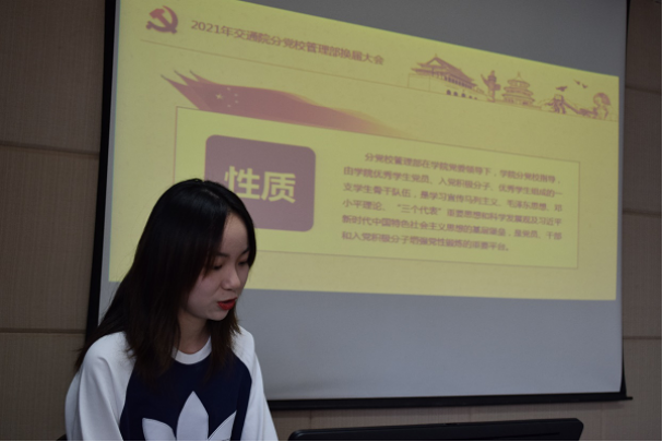 2021年分党校管理部换届大会在交通楼513室顺利举行。学院研究生辅导员、党组织干事张佳琪,党组织干事朱显研及分党校管理部新老成员参加会议。会议由肖奕忆同学主持。
