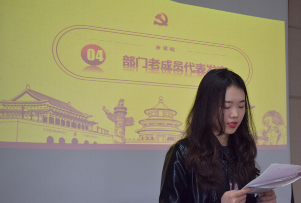 会议最后,由党组织干事朱显研老师讲话。她首先对自身经历做了简介,并代表领导与老师对上一届成员表达了感谢,对新成员的到来表示了欢迎。之后,她对分党校管理部新学年的工作做出了详细指导,如增开党史专栏、融入学年特色及做好党员大会前期准备工作等。