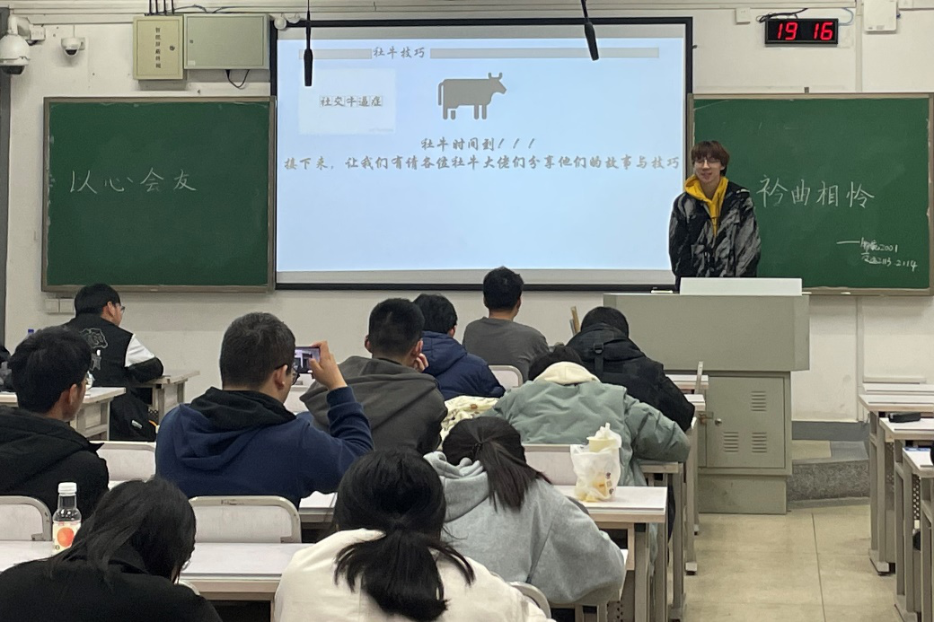 接着,各班同学代表上台分享自己的社交经历。各位代表真实地展现了大学生在面临社交问题和心理问题时的无助与迷茫,并且向大家展现了自己对每种病态心理的看法。