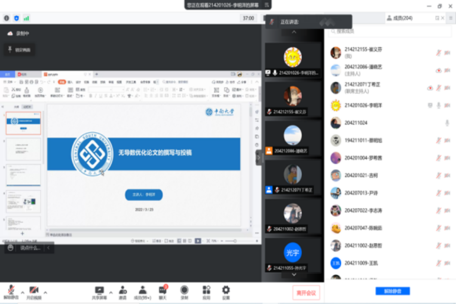 随后,李明洋与大家交流了“无导数优化论文撰写与投稿”的相关知识,分享了无导数优化及其方法的发展历程、寻找创新点的个人理解和无导数优化论文写作的个人经验。最后,李明洋就同学们在投稿期刊方面的问题提供了指导意见。