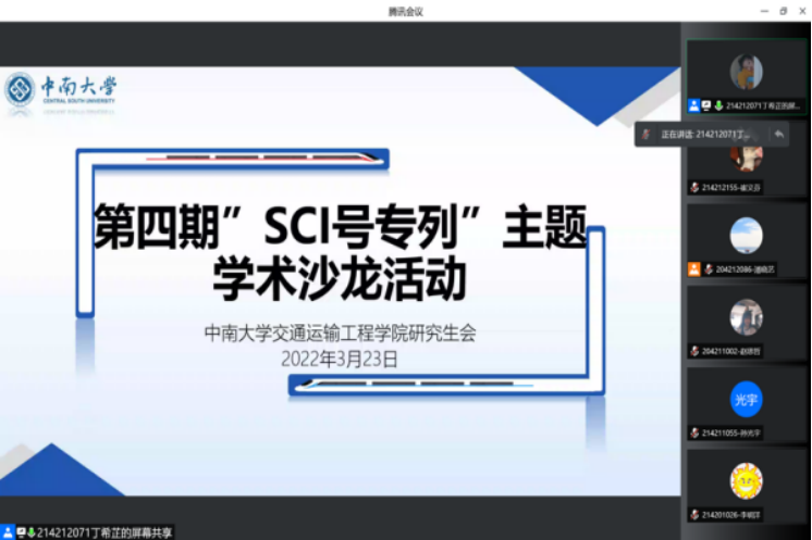 研究生会举办了第四期“SCI号专列”主题学术沙龙活动。根据学院疫情防控需要,本次活动以线上形式开展。本次学术沙龙活动由赵学艺和李明洋两位2021级博士生担任主讲人,共吸引了210名研究生及本科生参加。会议由交通院研究生会学术部干事丁希芷主持。