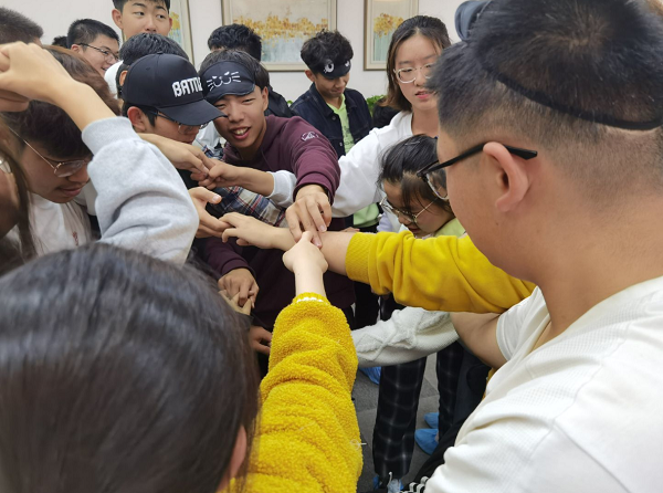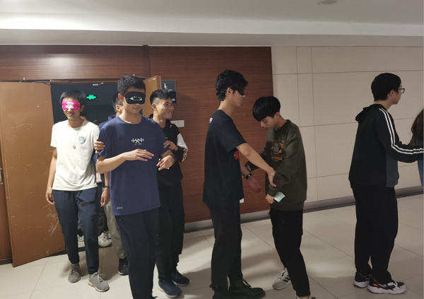 随后,在心灵契约的指引下,老师带领同学们进行了多项趣味游戏。其中有两个游戏很有意义。一个是解千手结,考验同学们如何依靠自身主观能动性及团队协作能力解开由自己缠绕而成的死结。面对难解的结,同学们齐心协力、合理分工,以最快的速度解开了它。另一个是盲人引导者,玩法是一位引导者带领一位带着眼罩的同学穿过一条布满障碍物的路,可以考验同学们之间的信任度的作用。盲行的同学都表现出些许害怕迷茫的情绪,但他们最后都在引导者的带领下避开障碍物,快速到达了终点。