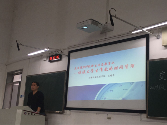 党委副书记宋晓东老师以《大学生的有效时间管理》为题,从“时间管理是什么”、“为什么提升时间管理的有效性”、“怎么做”三方面对大学生如何进行有效时间管理做了详尽的阐述,他的课程内容生动,案例鲜活,为在场新生传授大学生科学的时间管理方法,鼓励大一新生合理利用时间、利用好零散时间、劳逸结合,学会管理时间,提高学习效率。