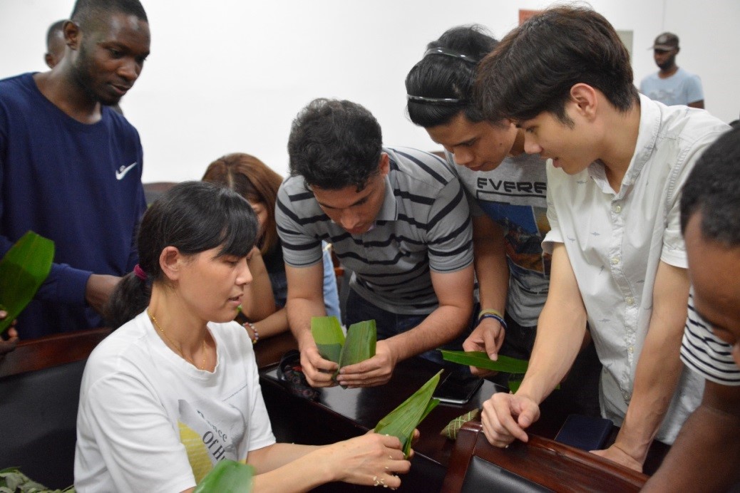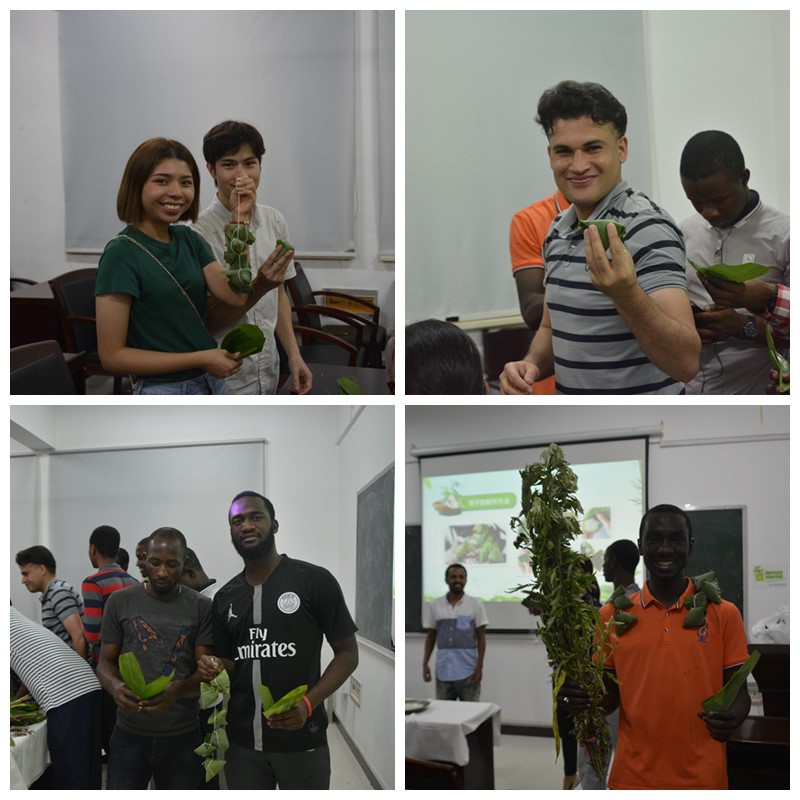 515教室里弥漫着清新粽香,充满了欢声笑语。来自尼日利亚、巴基斯坦、埃塞俄比亚、泰国等近30名留学生欢聚一堂,在留学生班导师蔡灿老师的组织下,跟着中国师傅学习包粽子,体验中国传统文化,共庆端午佳节的来临。
