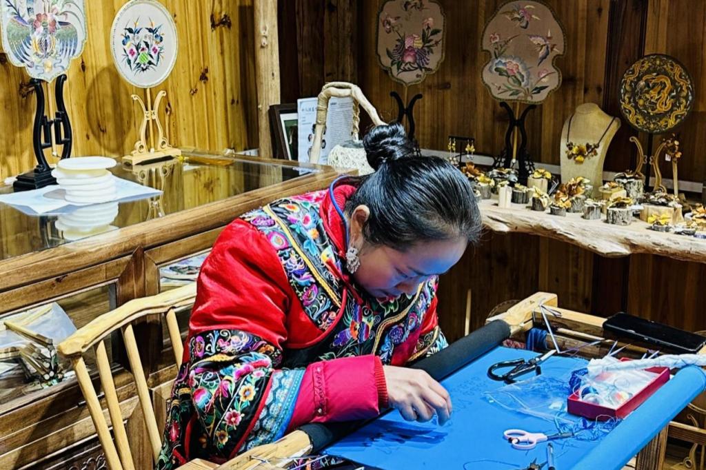 最后,第三小组前往苗绣合作社。苗绣合作社自2014年成立至今,秉持着习近平总书记提出的“实事求是,因地制宜,分类指导,精准扶贫”的重要理念,让留守妇女和老人利用传统苗绣技艺为乡村振兴贡献出自己的力量。在与合作社负责人的交流中,小组成员了解到合作社目前有100多名绣娘,她们充分利用网络媒介,销售范围覆盖全国,将民族元素与时代元素融合到一起,把以前自己绣自己穿的苗绣作品,变成了赠送外宾的高档礼品,成为了十八洞村的一张靓丽的名片。