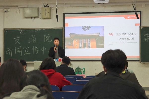 经过短暂的休息,下午4点30分,第七届新闻宣传中心宣传能力培训会准时开始。会议邀请了机电院研究生辅导员徐宏岩和第六届新闻宣传中心主任彭薇仪为大家作新闻摄影和新媒体宣传培训,此外,交通院20级、21级的班级宣传委员、团学会和心助会的宣传干事都加入到此次培训。