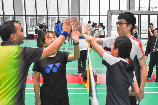 在上午进行的小组赛中,交通院师生代表队出师大捷,先后击败自动化院和资生院,率先拿下2个大比分。在下午的小组赛中,交通院师生代表队渐入佳境,火力全开,以气贯长虹的气势战胜了公管院、学工部、湘雅医院、国际教育学院和化工院。值得一提的是,在对战国际教育学院时,在男双遗憾失分的情况下,女双和混双顶住压力,扭转局势,在混双的第二局中更是打出了11:0的碾压战绩,最终交通院以全胜战绩小组第一晋级八强。
