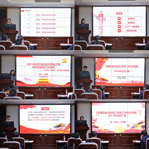 首先由各个支部书记就本年度支部和个人工作进行述职,最先进行汇报的是教职工党支部书记。交通运输系教工党支部、交通设备与控制工程系教工党支部、物流工程系教工党支部、高速列车研究中心教工党支部的4个支部书记分别从支部2021年的基本工作情况、书记的履职情况、教职工党员这一年的科研成果、支部的组织生活等方面都进行了详细介绍,同时也都指出了这一学年在支部建设中存在的问题,以及未来改进的方向。学院党委成员对四个教工党支部进行了点评,在支部建设、党史学习教育等方面都有所进步,但仍然存在先锋模范带头作用还发挥不够的问题,下一步要继续加强。对于高速列车研究中心党支部尤其提出要配合学校做好寒假期间的疫情防控工作。