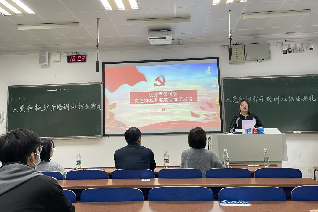 随后,交控2101班张铭宜同学作为优秀学员代表发言。她首先对此次培训班的全体授课教师表示感谢,并表示通过各项教学环节,她逐步明晰了中国共产党艰苦卓绝的奋斗历程,深刻体悟了党的二十大精神,明确了当代青年的历史使命担当,更加坚定了把青春奋斗融入党和人民的建设事业中,为实现中华民族的伟大复兴贡献青春力量。最后,她呼吁全体学员不负韶华,砥砺前行,为党和人民服务贡献。