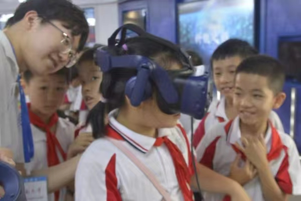 先进轨道交通科普基地的科普馆,志愿者李熠、江居瀚、彭程通过科普馆内特有的飞屏、触摸关联屏和VR互动等多种科普展示技术向队员们展示了轨道交通的基础知识与前沿科技,帮助队员们进一步了解轨道交通知识。在VR互动体验区,队员们体验了地铁车站场景,对地铁站的设施、车内零部件、车辆组成等有了更加具象化的认识。