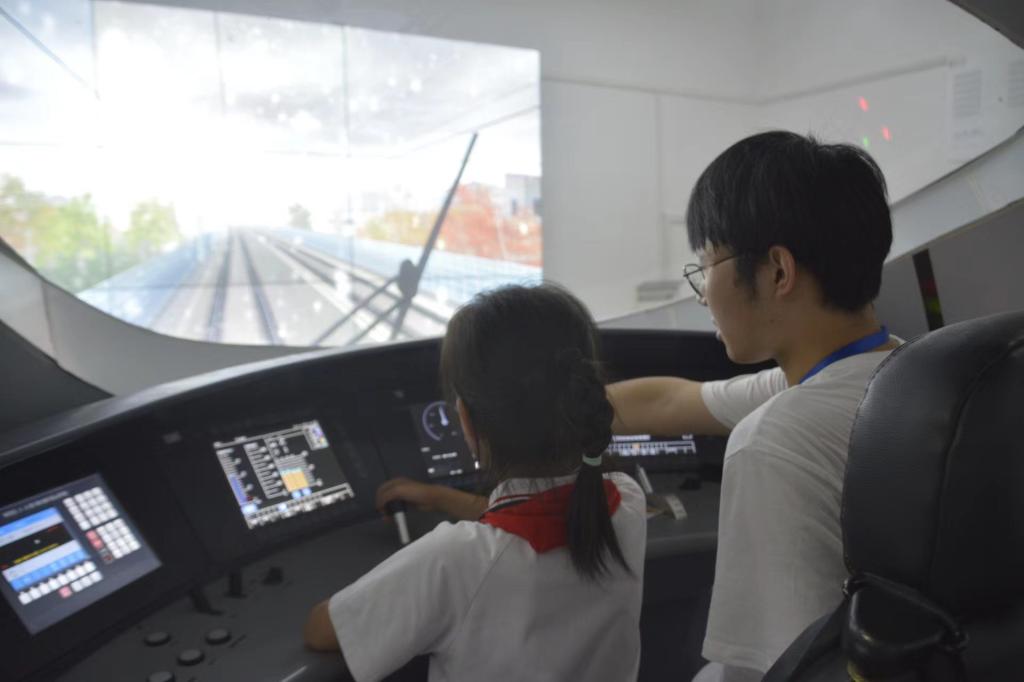 实地参观,书本知识活起来。活动伊始,中队辅导员饶宇晖老师带领少先队员们有序地来到高铁模拟驾驶室。驾驶室内摆放着一座1:1高铁仿真模拟驾驶舱,舱内的所有布局和设备与真实列车保持一致,前视景、侧窗视景均还原了现场实景,驾驶的时候还可以产生真实的速度感。科普基地志愿者韩得民、王鑫向队员们具体介绍了驾驶室的原理、组成及仪器的操作方法,并邀请部分同学亲自体验。