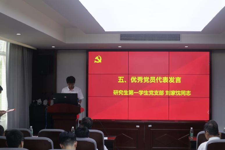在颁奖仪式后,优秀党员代表刘家忱发言。他就个人在学院的成长历程、党支部的工作以及作为学生党员的责任和决心讲述自己的心路历程,表达了对学校、党组织的感激之情;并借此机会表达了三点决心:第一,提高科研创新能力,加强专业理论素养;第二,积极参与党建工作,助力学院党建发展;第三,树立远大理想抱负,不忘入党初心使命。最后,他用习近平总书记寄语青年的话语,鼓励学生党员坚定不移听党话,跟党走,怀抱梦想又脚踏实地,让青春在全面建设社会主义现代化国家的火热实践中绽放绚丽之花。