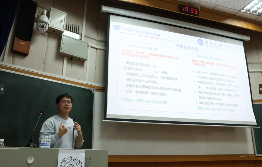 随后,主讲人谢国权分享了科研论文撰写的经验,包括开题报告的框架和写作方法、开题答辩PPT的结构和内容,以及开题答辩经验。演讲中,谢国权详细介绍了科研论文写作的技巧和要点,就开题报告框架和PPT内容设计给出建议,进一步分享了自己在开题答辩中的经验和教训,鼓励同学们充分准备,自信应对答辩环节。另外,谢国权着重强调了每个人的贡献和创新对于实现交通强国目标的重要性,激发同学们的责任感和使命感。