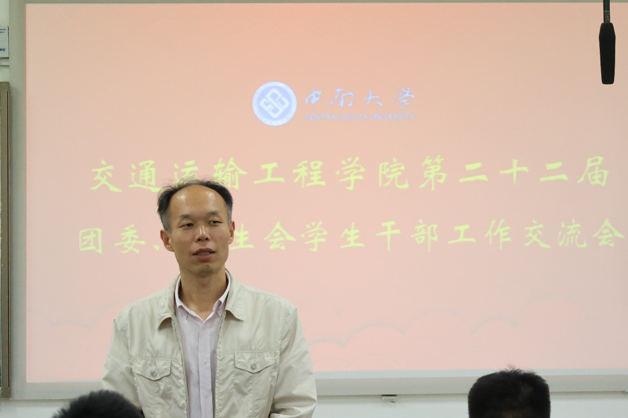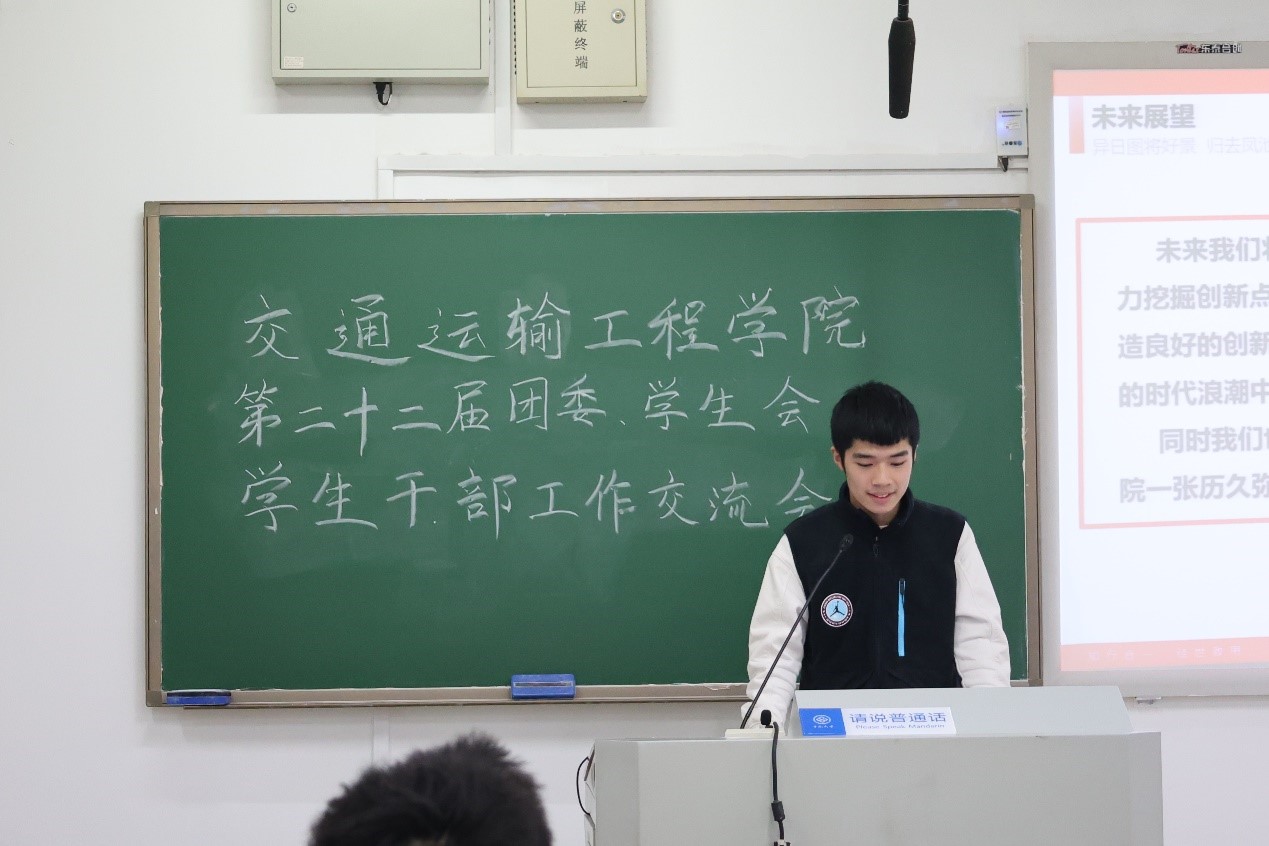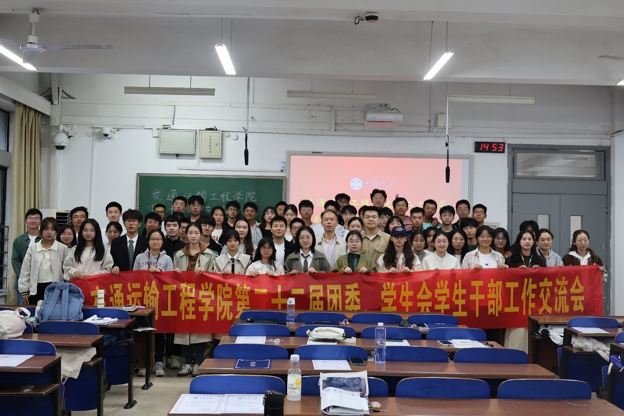 于新校区教学楼A117召开第二十二届团委、学生会学生干部工作交流会。本次会议邀请交通院党委副书记李苑,院团委书记张健,院团委副书记郑繁简出席,由团委、学生会主席吉文韬主持,团委、学生会全体成员参加。