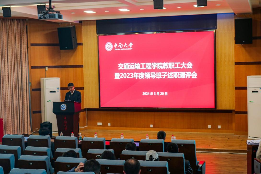 院党委书记袁世平代表学院领导班子作2023年度述职报告。他从坚持和加强党的全面领导,持续发挥政治功能;全面贯彻党的教育方针,持续加大人才培养工作力度;立足“四个面向”,持续推动学科高质量发展三个方面汇报了2023年的工作。他提到,2023年,学院党委坚持以习近平新时代中国特色社会主义思想和党的二十大精神为指导,持续推进学习贯彻习近平新时代中国特色社会主义思想主题教育,围绕创建“中南特色、全国一流的全国党建工作标杆院系”总目标,坚持党建引领、赋能增效,以高质量党建引领一流学科发展,学院全体师生踔厉奋发、笃行不怠,硕果累累。获国家本科教学成果二等奖1项、国家研究生教学成果奖二等奖1项、国家虚拟仿真一流课程1项、获批留学基金委创新型人才国际合作培养项目1项;全年科研进账经费1.3亿,主持国家重点研发项目1项,发表SCI论文Q1区收录231篇。2024年,希望全院教职工全面贯彻党的教育方针,牢记立德树人使命,以更饱满的热情、更昂扬的斗志、更务实的作风,团结一致、努力拼搏,在以中国式现代化全面推进强国建设、民族复兴的历史伟业中贡献中南交通力量。
