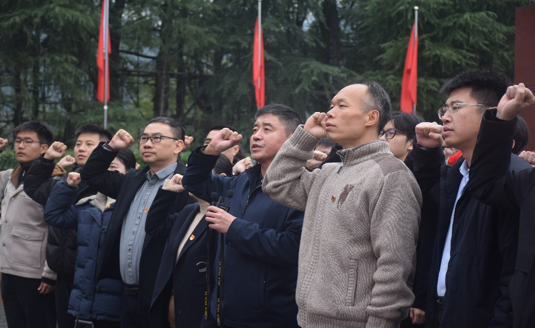 在铜像一侧,袁世平书记领读,全体党员庄严地举起右手,用最宏亮的声音重温入党誓词,以对党的绝对忠诚和铮铮誓言,再一次接受共产主义理想信念的精神淬炼和灵魂洗礼。