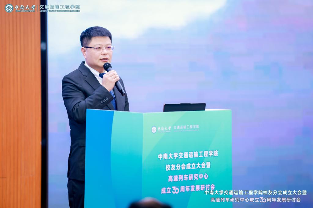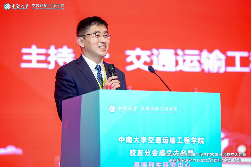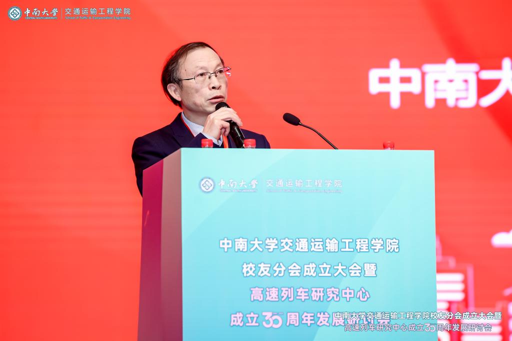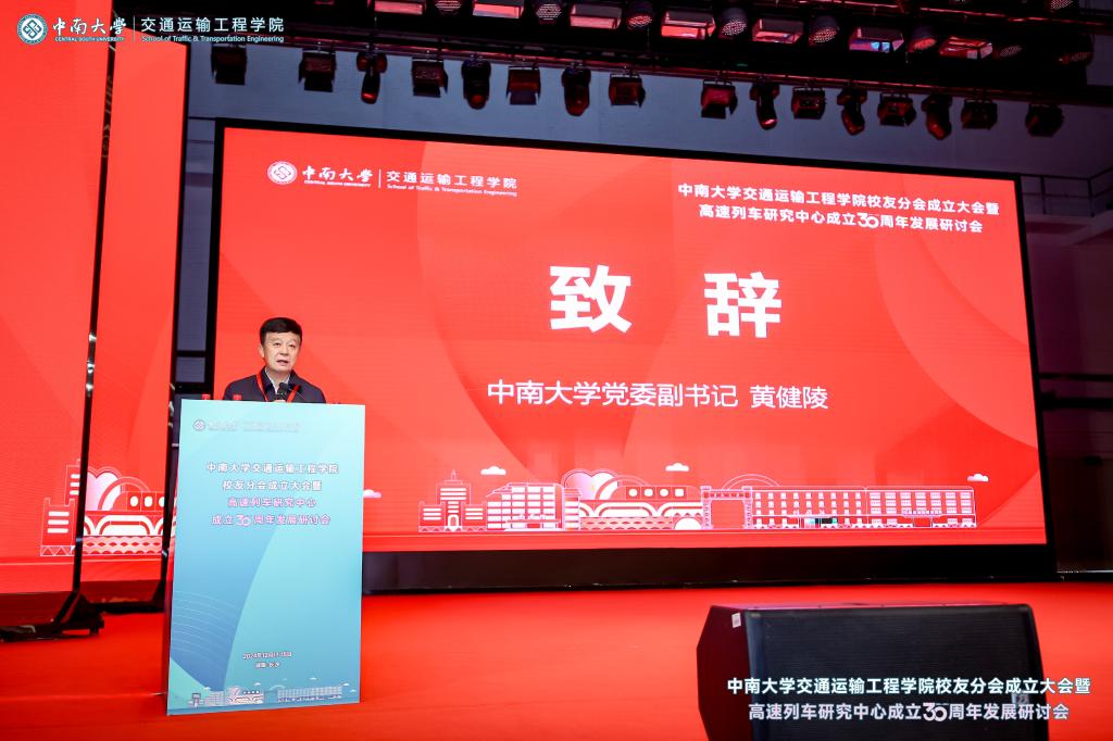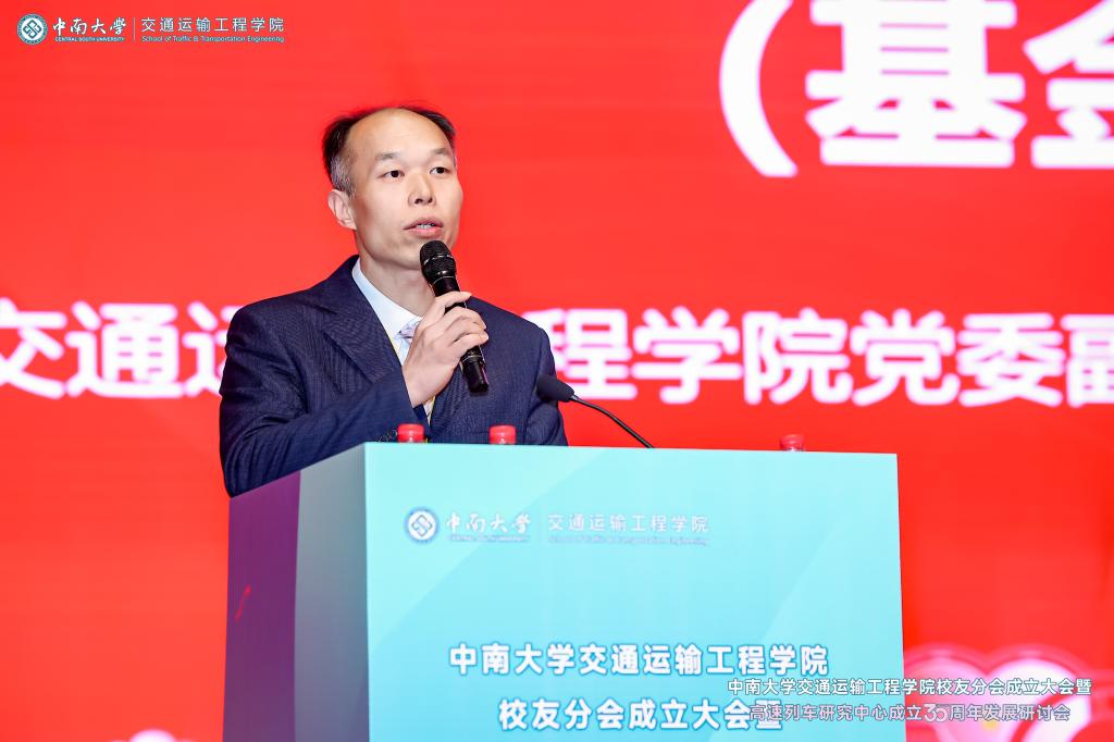 党委副书记黄健陵代表学校致辞。他在讲话中指出,校友分会的成立将进一步团结凝聚广大交通校友,为全球的中南交通人搭建联络情感、交流合作和爱校荣校的平台,共同助力学院和学科的高质量发展。他希望校友分会不仅要做好服务校友的“贴心人”,联系校友的“连心桥”,更要充分挖掘和发挥资源优势,组织广大校友探索深度参与产教融合的新模式,助力校友与母校双向赋能,共创辉煌。