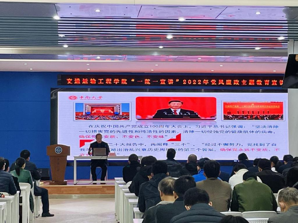 为进一步贯彻中共中央办公厅《关于加强新时代廉洁文化建设的意见》,落实学校纪委“六个一”工作思路和举措,营造风清气正的学院氛围,11月29日下午,校党委巡视办主任刘奇伟在铁道校区立志厅作了题为“增强全面从严治党永远在路上的政治自觉,确保党不变质、不变色、不变味”的廉政教育专题宣讲,学院党政领导、全体教职工党员参加,宣讲会由学院党委副书记宋晓东主持。
