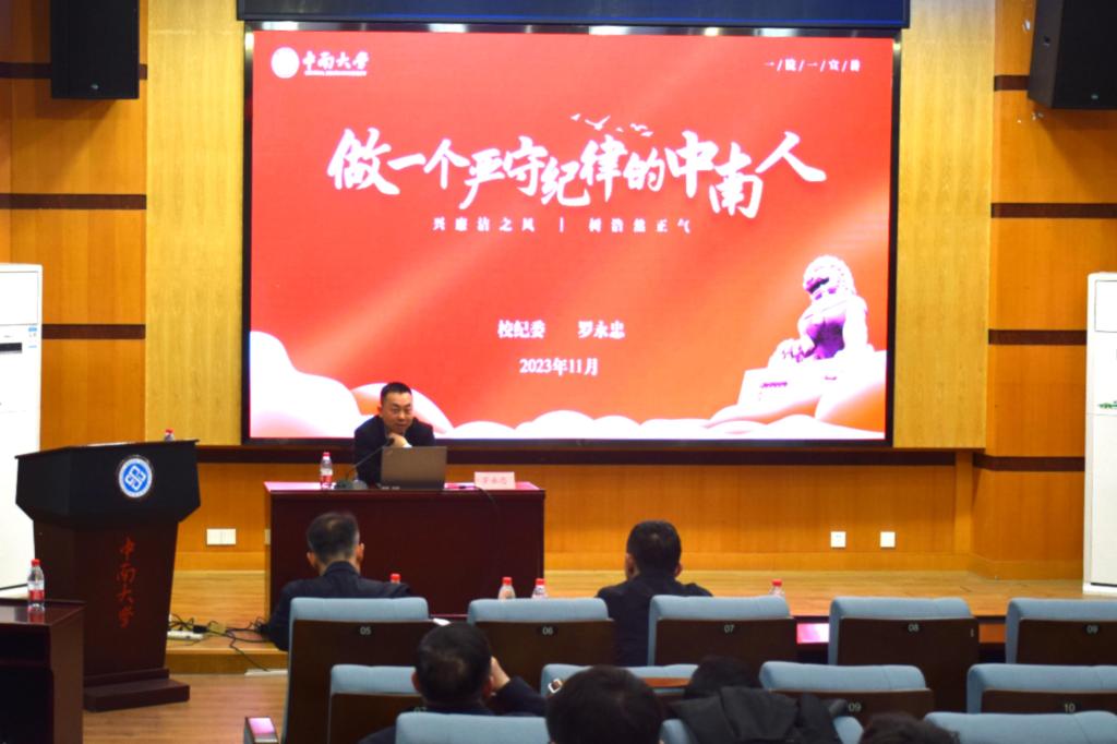 纪律检查委员会副书记、纪委办公室主任罗永忠在世纪楼C201作了题为“做一个严守纪律的中南人”的廉洁教育专题宣讲。会议由51吃瓜网
