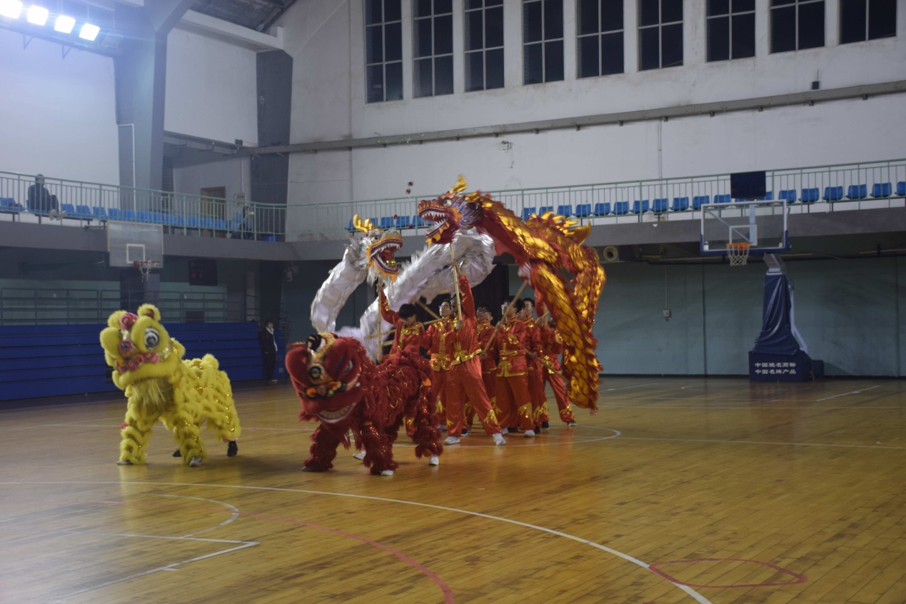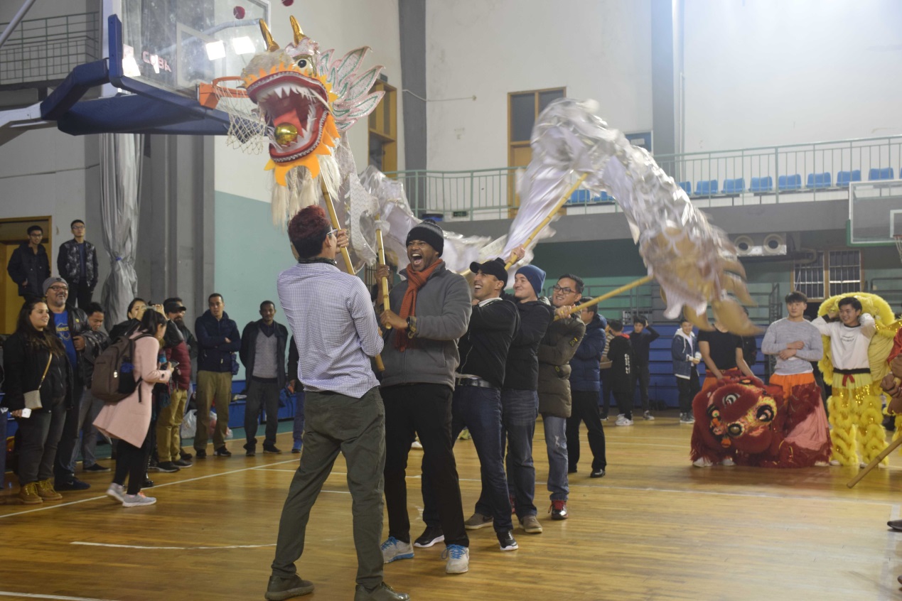 表演过后,外国留学生队伍进行舞龙舞狮表演,留学生们舞动的金色大龙盘旋而上,在会场上翻腾起舞,胜似真龙,翻腾云霄,带动一片欢腾。留学生舞龙舞狮队曾参加两届中国大学生留学生组舞龙舞狮锦标赛,并取得了不俗的成绩,一次冠军和一次亚军的荣誉,证明了他们的过人实力,以及对中华传统文化的无限热忱。