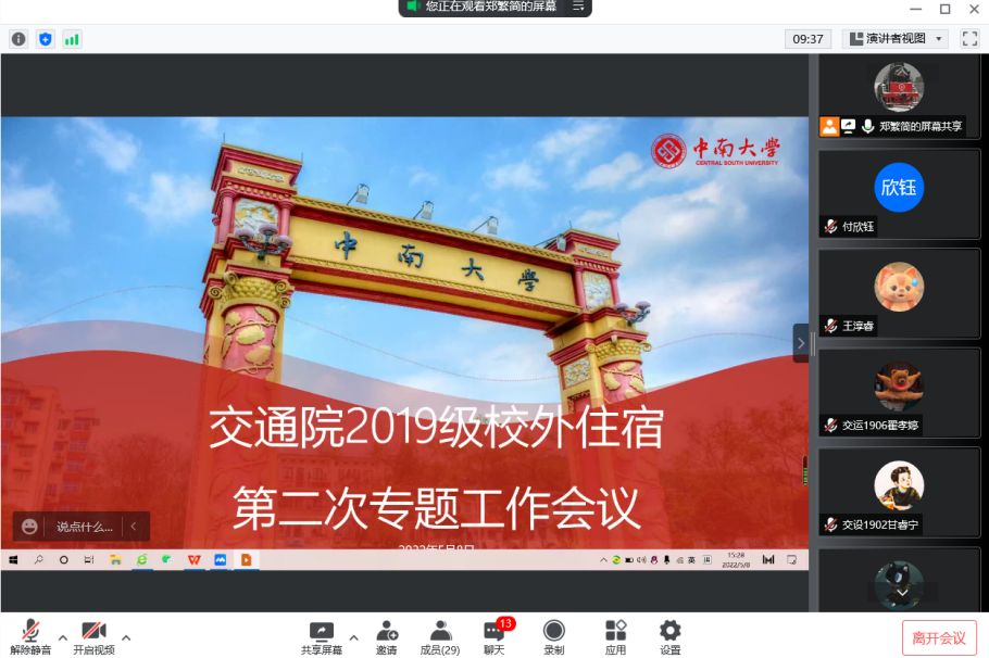 5月8日下午3点,交通院2019级在线上顺利举行本学期校外住宿第二次专题工作会议。交通院19级全体校外住宿同学参加了此次会议,会议由19级辅导员郑繁简老师和生活专干韦玉芹主持。会议伊始,生活专干韦玉芹结合近期发生的长沙望城区自建房坍塌事件,向同学们进行了“远离危房”知识的普及和房屋坍塌避险要领的讲解,号召同学们自查校外住房房体建筑以及周围环境可能存在的安全隐患,并及时向辅导员和房东反映,积极解决问题。安全...