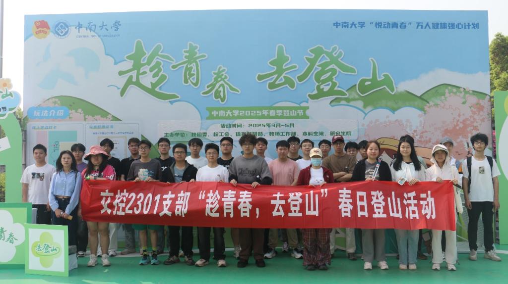3月27日上午,交控2301团支部于岳麓山校区举行“趁青春,去登山”春日登山活动。交控2301班全体同学参与本次活动。活动伊始,全体同学准时在“趁青春,去登山”桁架前集合。团支书在出发前宣读安全须知,并组织同学进行热身运动。由于天气炎热,班委团队为大家准备了矿泉水,在登山前发至每位同学手中,确保轻装上阵,能量满格。接着,班级同学自动分为四组,先后从岳麓山脚下打卡点出发,正式开启了登山活动。山路崎岖,登山过...
